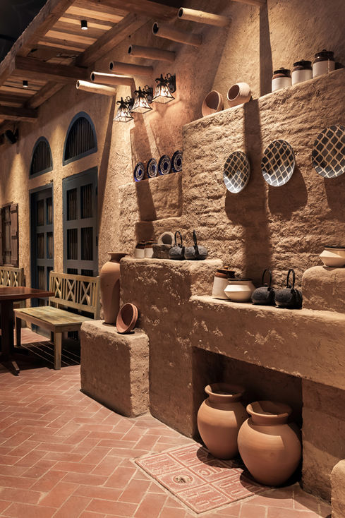 Baba's restaurant draws its inspiration from the architecture styles of rural havelis and houses of Punjab. The idea is to create an upcycled space with a traditional material palette from around the context. The entrance alley is a longitudinal monolithic axis created using mud plaster/phuska and depicts the bazaar streetscape using different volumes, elements and layers. Masons and artisans were brought in from the neighbouring villages to create the phuska mixture and apply it on the walls/surfaces. The brick flooring of the alley in a herringbone pattern enhances the old-world charm of the space. The alley flows into the indoor seating area which follows a similar spatial language. The existing yellow kota flooring was retained in most areas and patchwork of terrazzo were added organically where kota was damaged. The addition of terrazzo to kota flooring was reminiscent of the incremental architecture style of India where one can see the different layers that get added by different patrons throughout time. A textured ceiling of bamboo and wooden beams add weight to the softness of the indoor area. The indoor space is segregated from the court and the staircase through semicircular arches that frame both the spaces in a beautiful manner. The courtyard walls are rendered in Nanakshahi bricks that used to be the main cladding material for rural architecture. Terracotta pots in different sizes that were created by local potters are layered against the brick and they double up as wall washing light fixtures. The bar is another monolithic injection in one corner of the court. The bar surfaces (sides, roof and the back) are cladded in bamboo and plaster that blend in to create a uniform beige layer. The bar front is done in olive handmade glazed tiles that is juxtaposed against a subdued backdrop. The freestanding bar front creates an ethereal aura and dissipates energy into the somber space. Baba's is a contemporary vernacular take on Indian Dhabas whose vivid informal vibe is tweaked to create a purist semi formal space but which is true to its culture and context.